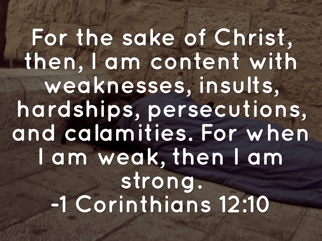 For the sake of Christ, then, I am content with weaknesses, insults, hardships, persecutions, and calamities. For when I am weak, then I am strong.