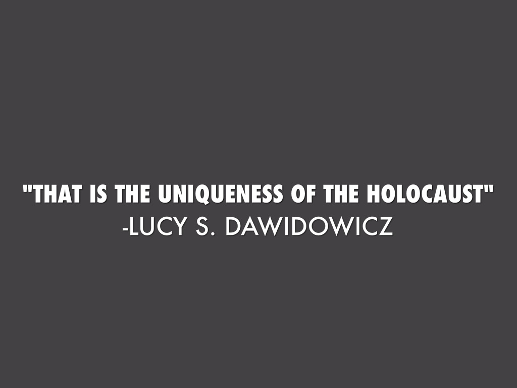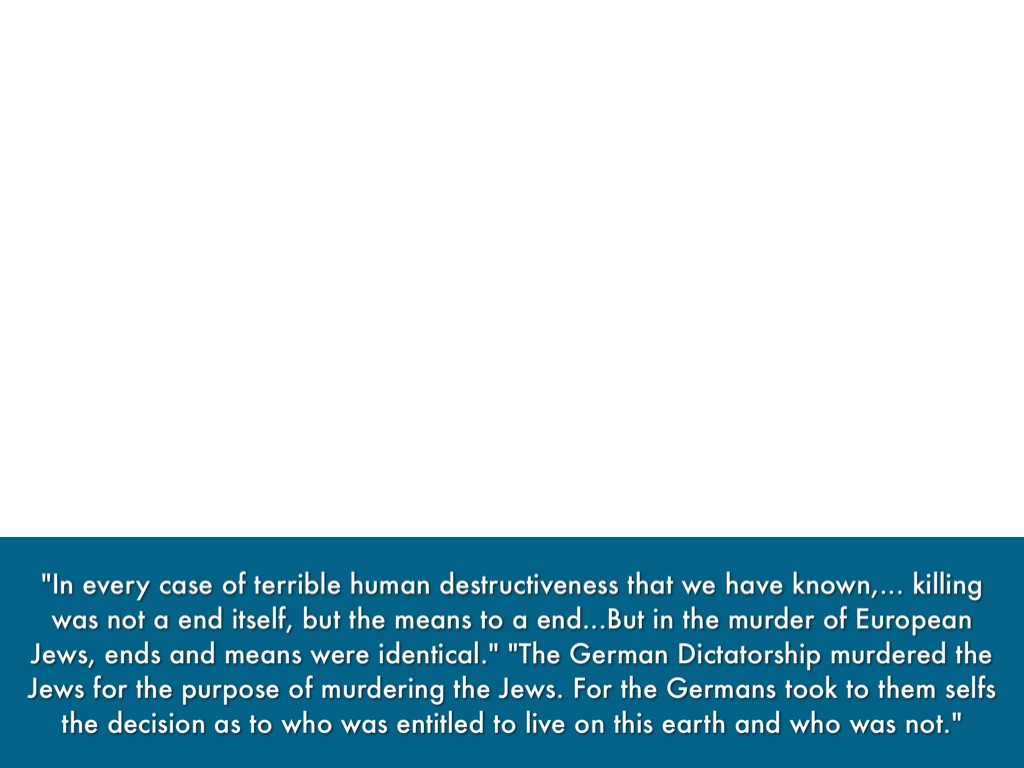 "In every case of terrible human destructiveness that we have known,... killing was not a end itself, but the means to a end...But in the murder of European Jews, ends and means were identical." "The German Dictatorship murdered the Jews for the purpose of murdering the Jews. For the Germans took to them selfs the decision as to who was entitled to live on this earth and who was not."
