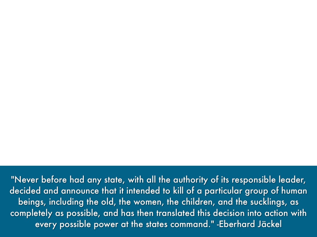 "Never before had any state, with all the authority of its responsible leader, decided and announce that it intended to kill of a particular group of human beings, including the old, the women, the children, and the sucklings, as completely as possible, and has then translated this decision into action with every possible power at the states command." -Eberhard Jäckel