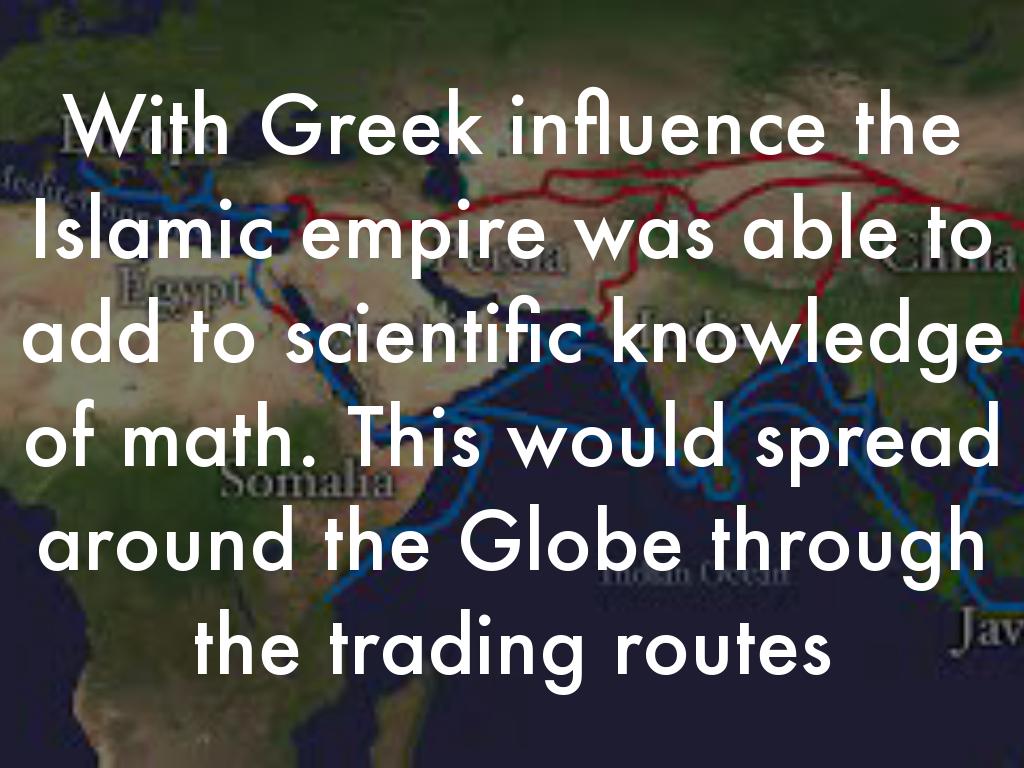 With Greek influence the Islamic empire was able to add to scientific knowledge of math. This would spread around the Globe through the trading routes