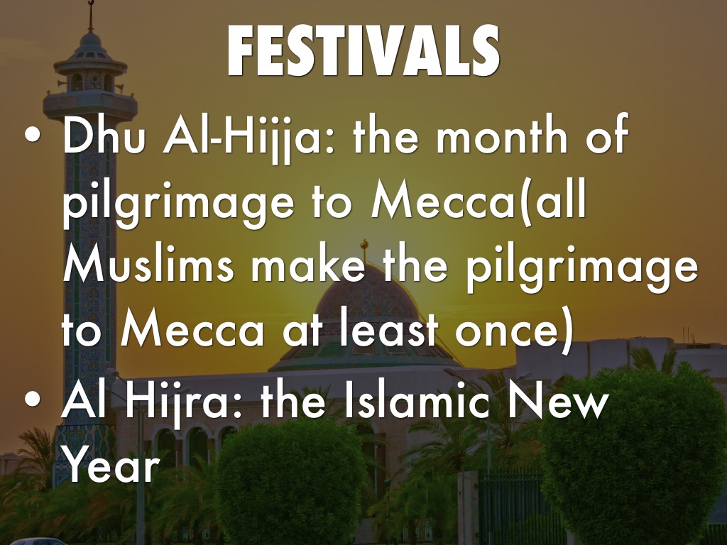Dhu Al-Hijja: the month of pilgrimage to Mecca(all Muslims make the pilgrimage to Mecca at least once)