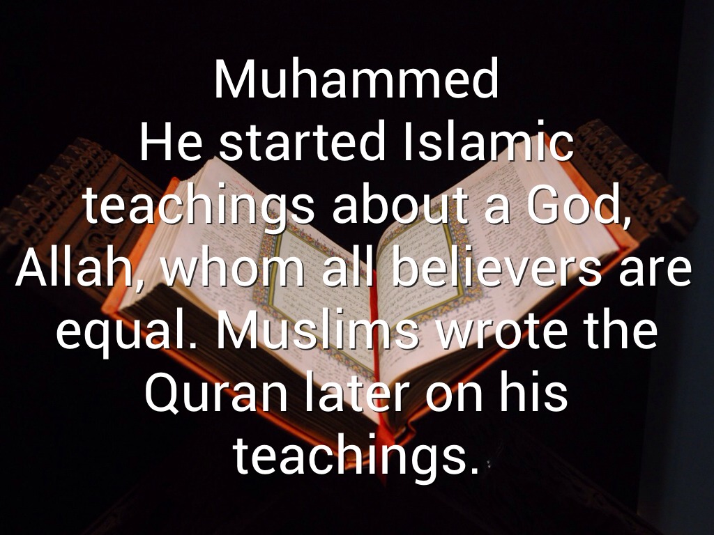 He started Islamic teachings about a God, Allah, whom all believers are equal. Muslims wrote the Quran later on his teachings.
