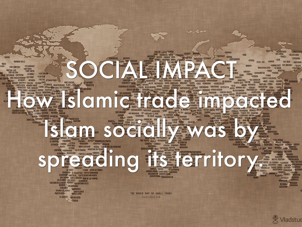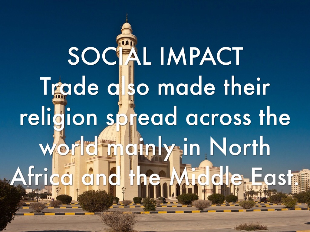 SOCIAL IMPACT Islamic trade also made their religion, Muslim, more accepted in the world. This is because many people traded with them, causing them to be more familiar their culture.