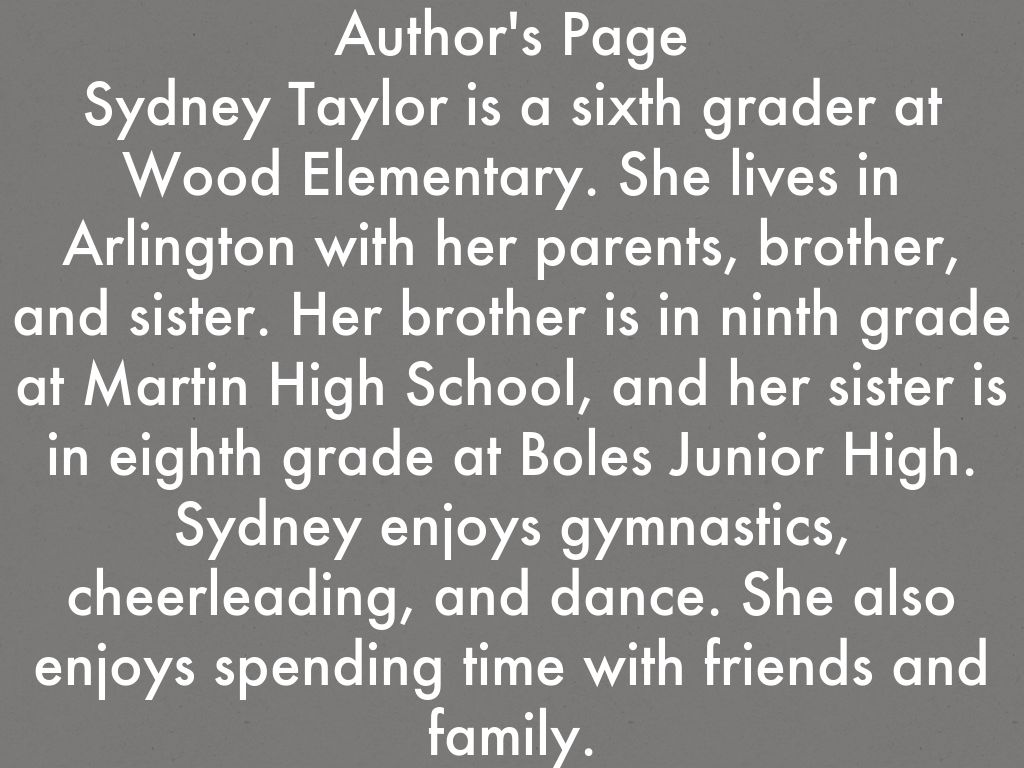 Sydney Taylor is a sixth grader at Wood Elementary. She lives in Arlington with her parents, brother, and sister. Her brother is in ninth grade at Martin High School, and her sister is in eighth grade at Boles Junior High. Sydney enjoys gymnastics, cheerleading, and dance. She also enjoys spending time with friends and family. When she is older, Sydney hopes to be a doctor.
