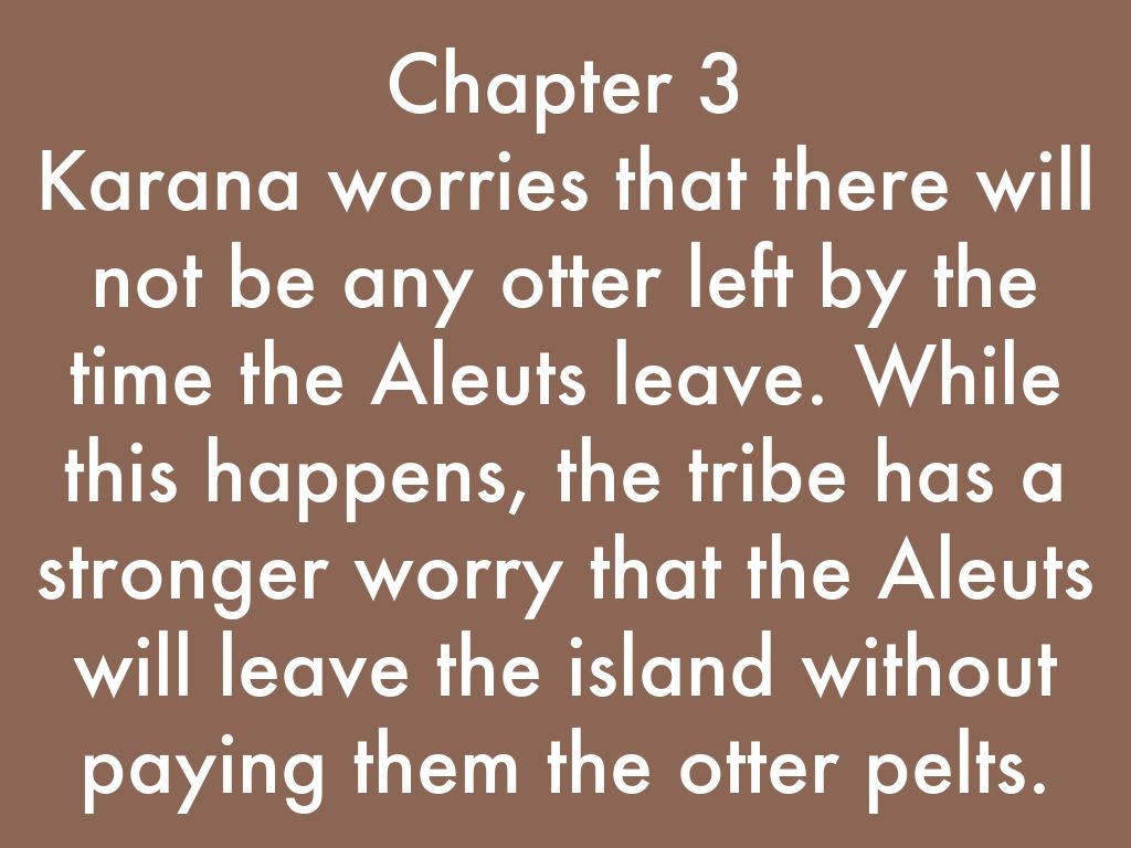 Karana worries that there will not be any otter left by the time the Aleuts leave. While this happens, the tribe has a stronger worry that the Aleuts will leave the island without paying them the otter pelts.