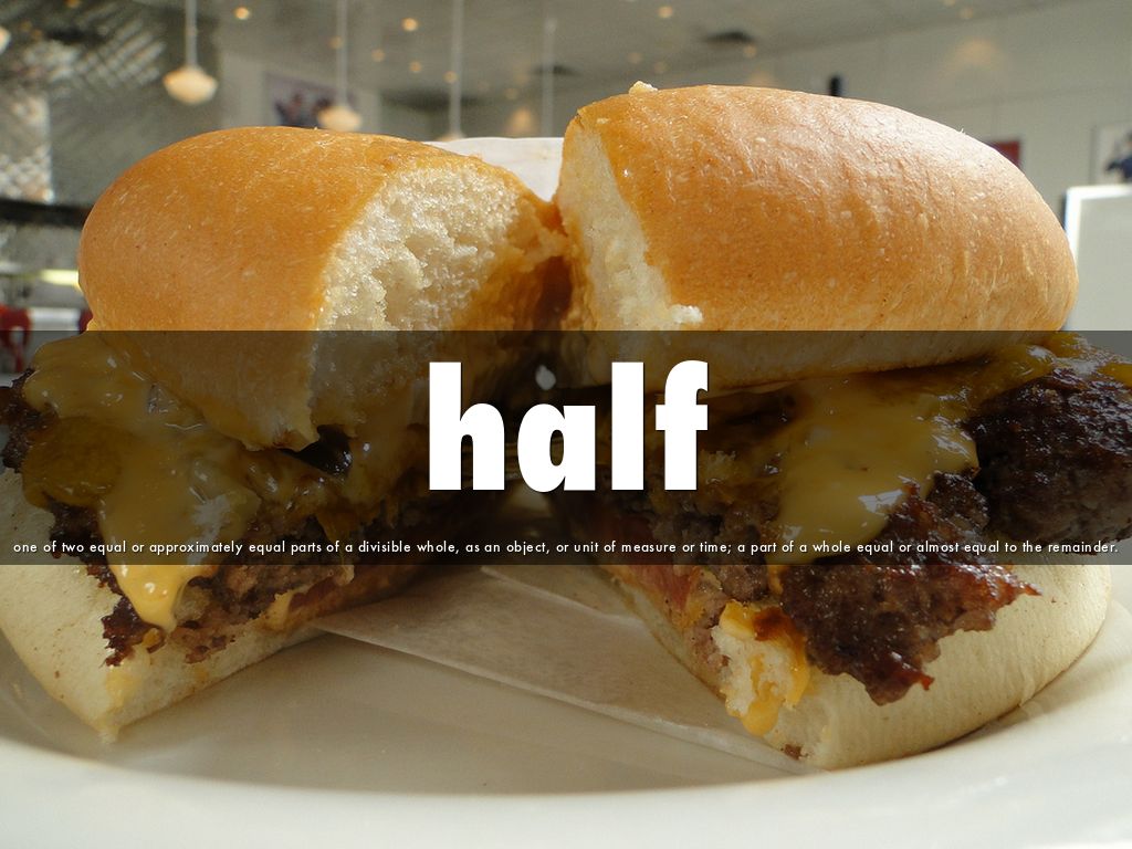 one of two equal or approximately equal parts of a divisible whole, as an object, or unit of measure or time; a part of a whole equal or almost equal to the remainder.