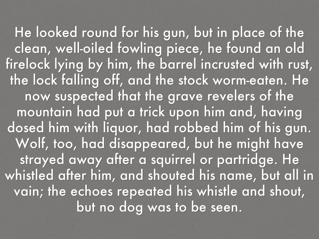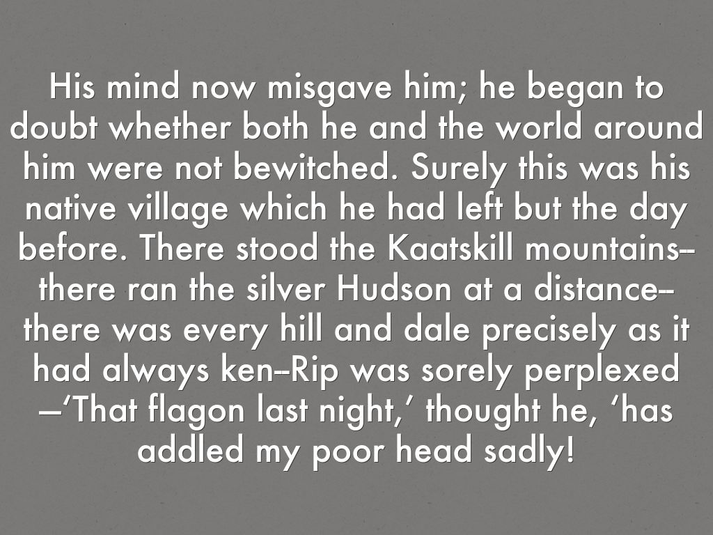 His mind now misgave him; he began to doubt whether both he and the world around him were not bewitched. Surely this was his native village which he had left but the day before. There stood the Kaatskill mountains--there ran the silver Hudson at a distance--there was every hill and dale precisely as it had always ken--Rip was sorely perplexed—‘That flagon last night,’ thought he, ‘has addled my poor head sadly!