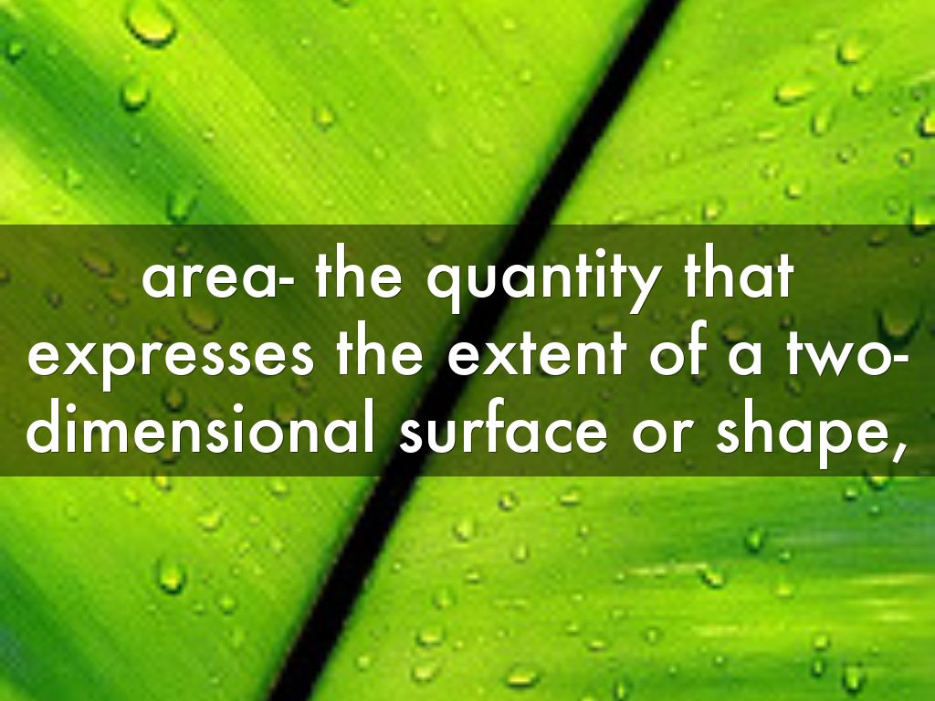 area- the quantity that expresses the extent of a two-dimensional surface or shape,