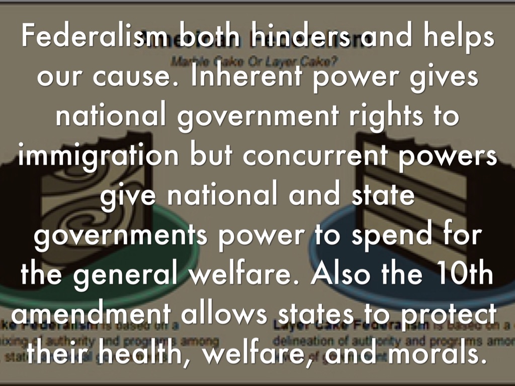 Federalism both hinders and helps our cause. Inherent power gives national government rights to immigration but concurrent powers give national and state governments power to spend for the general welfare. Also the 10th amendment allows states to protect their health, welfare, and morals.