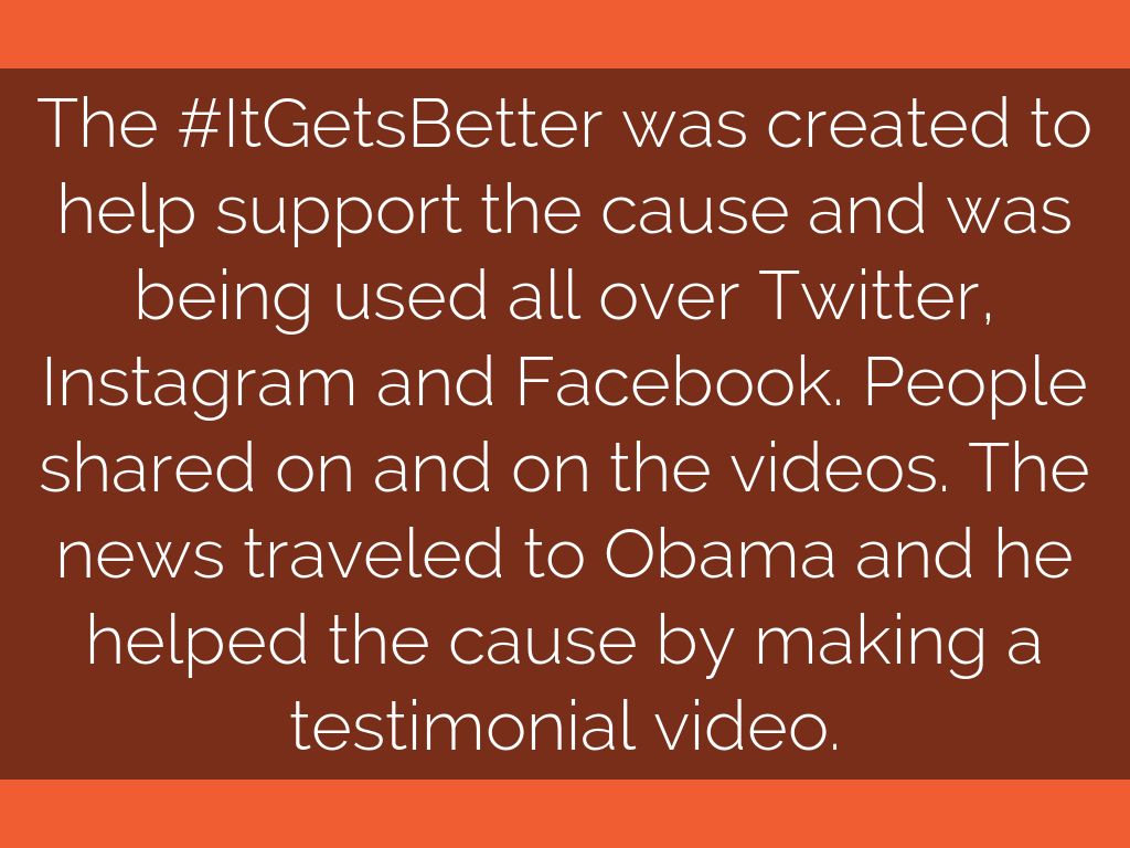 The #ItGetsBetter was created to help support the cause and was being used all over Twitter, Instagram and Facebook. People shared on and on the videos. The news traveled to Obama and he helped the cause by making a testimonial video.