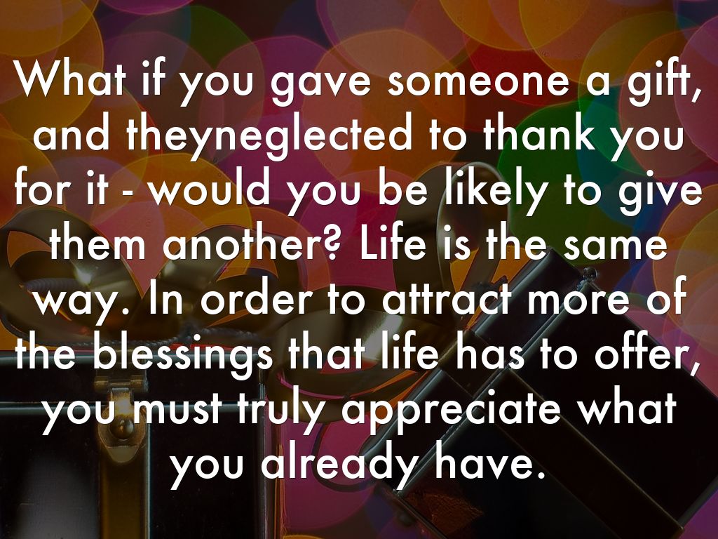 What if you gave someone a gift, and theyneglected to thank you for it - would you be likely to give them another? Life is the same way. In order to attract more of the blessings that life has to offer, you must truly appreciate what you already have.