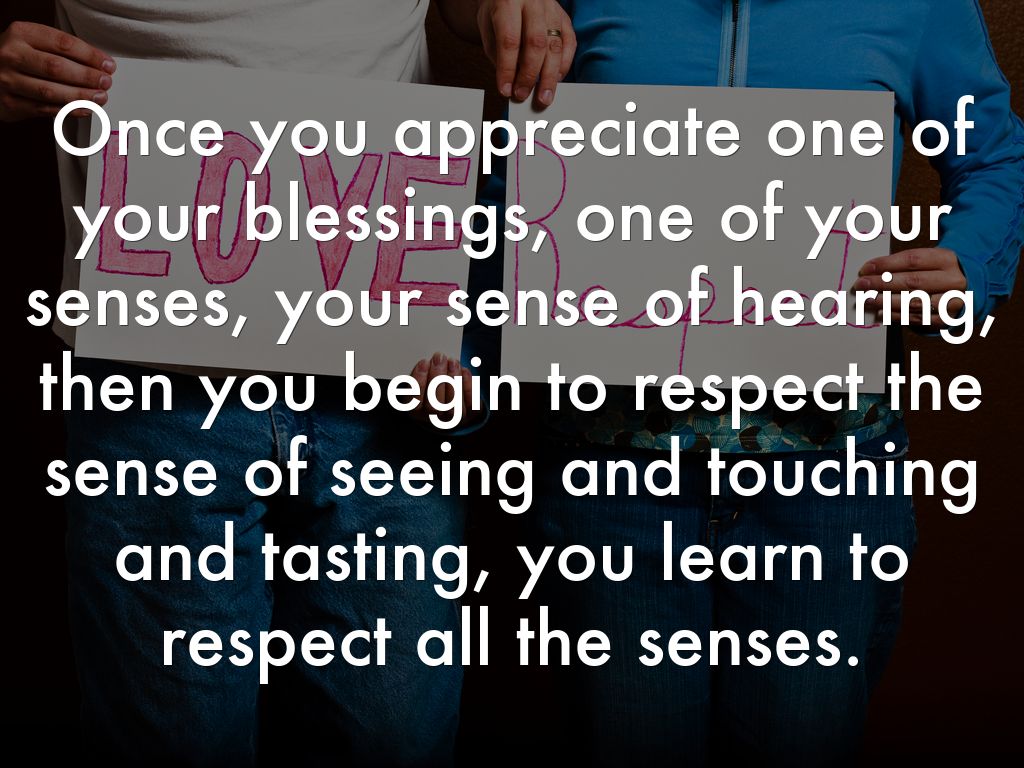 Once you appreciate one of your blessings, one of your senses, your sense of hearing, then you begin to respect the sense of seeing and touching and tasting, you learn to respect all the senses.