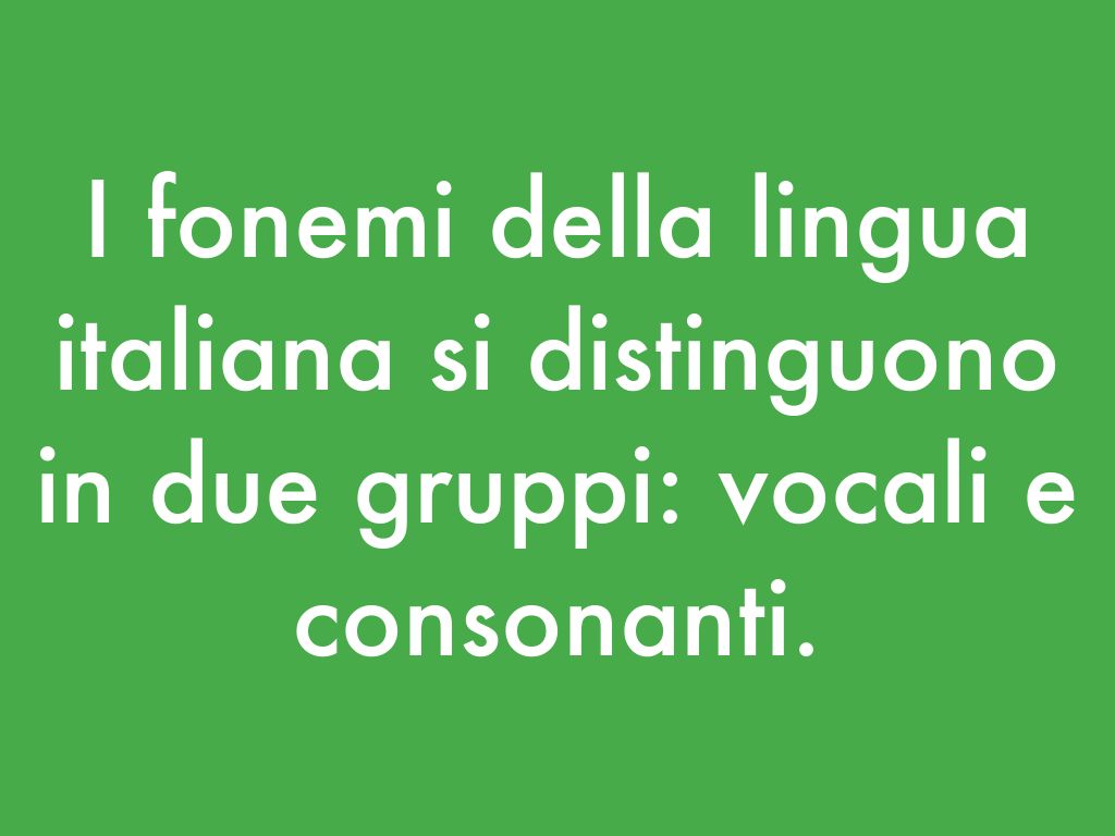 I fonemi della lingua italiana si distinguono in due gruppi: vocali e consonanti.