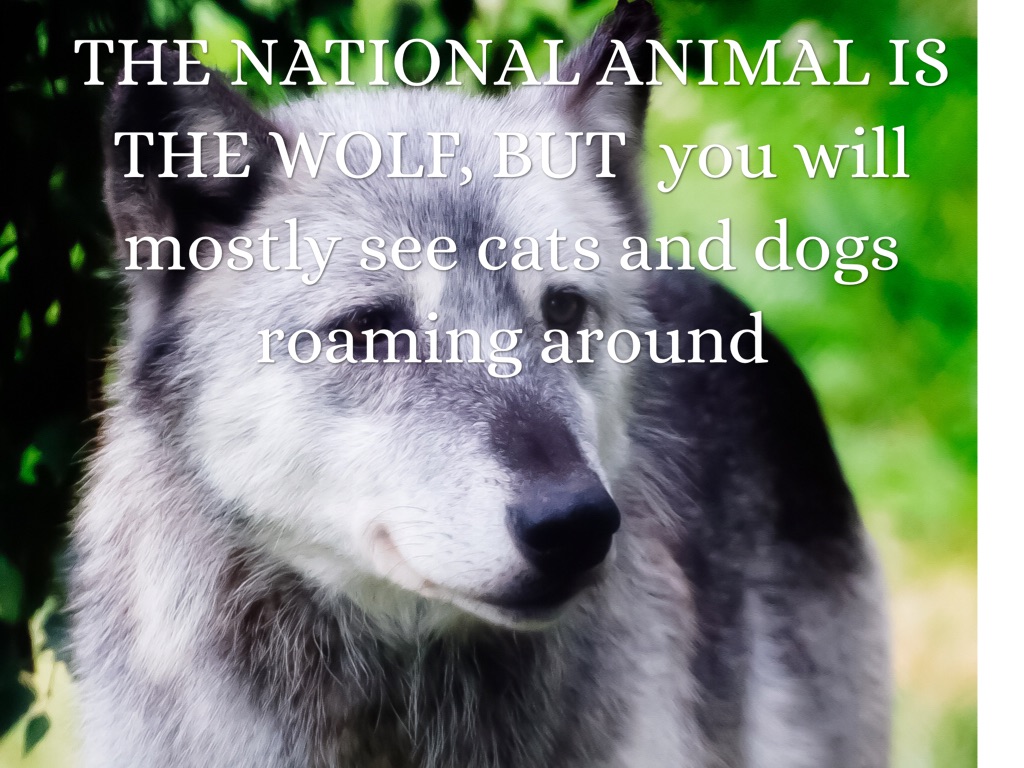 THE NATIONAL ANIMAL IS THE WOLF, BUT you will mostly see cats and dogs roaming around