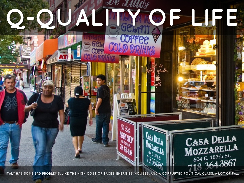 Italy has some bad problems, like the high cost of taxes, energies, houses, and a corrupted political class. A lot of family have economical problems and the situation is going worse. Besides of this, common culture is higher compared to the american one, italians are very interested to culture, and school teaches a lot of history, philosophy, like math.