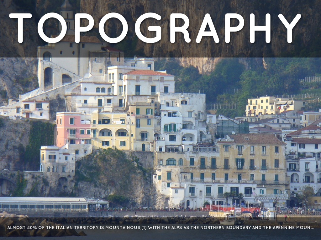 Almost 40% of the Italian territory is mountainous,[1] with the Alps as the northern boundary and the Apennine Mountains forming the backbone of the peninsula and extending for 1,350 km (840 mi)
