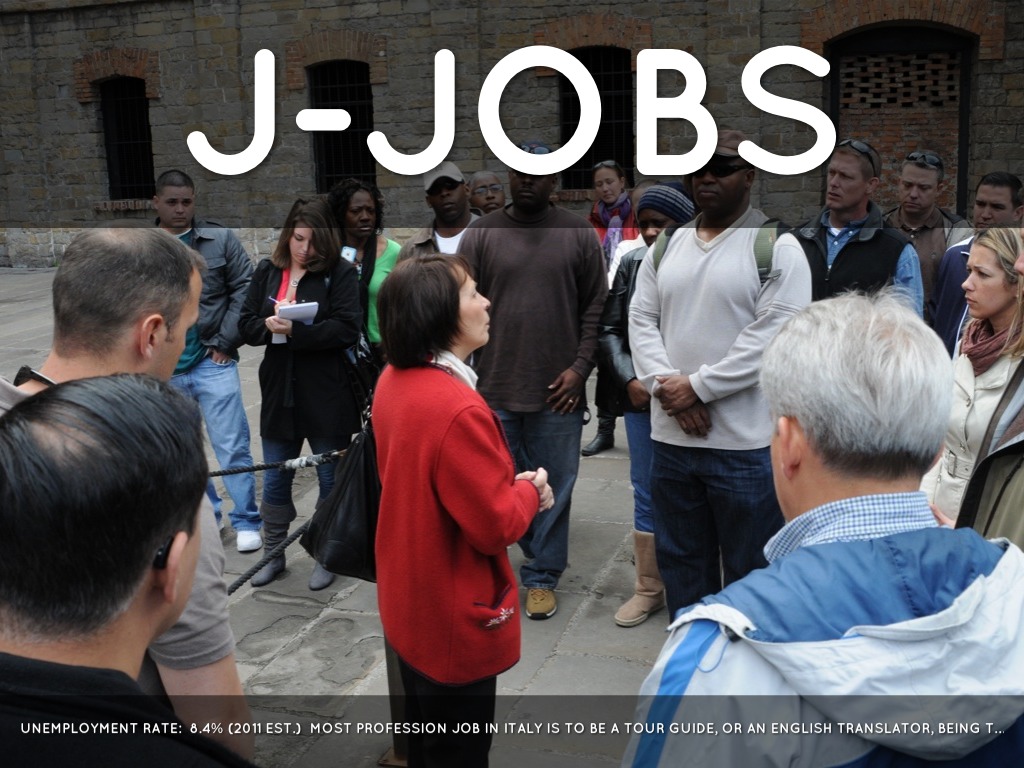 Unemployment rate: 8.4% (2011 est.) MOST PROFESSION JOB IN ITALY IS TO BE A TOUR GUIDE, OR AN ENGLISH TRANSLATOR, BEING THAT MOST OF THERE INDUSTRY COMES FROM TOURISM.