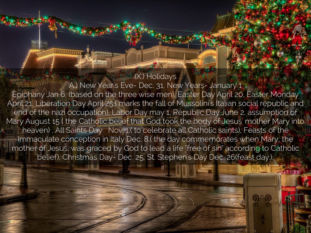 Epiphany Jan 6, (based on the three wise men), Easter Day April 20, Easter Monday April 21, Liberation Day April 25,( marks the fall of Mussolini's Italian social republic and end of the nazi occupation), Labor Day may 1, Republic Day June 2, assumption of Mary August 15 ( the Catholic belief that God took the body of Jesus' mother Mary into heaven) , All Saints Day Nov. 1,( to celebrate all Catholic saints), Feasts of the Immaculate conception in Italy Dec. 8,( the day commemorates when Mary, the mother of Jesus, was graced by God to lead a life "free of sin" according to Catholic belief), Christmas Day- Dec. 25, St. Stephen's Day Dec. 26(feast day.),