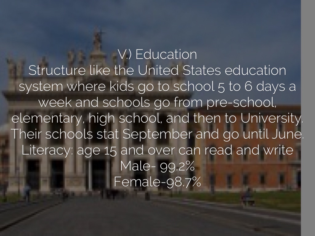 Structure like the United States education system where kids go to school 5 to 6 days a week and schools go from pre-school, elementary, high school, and then to University.