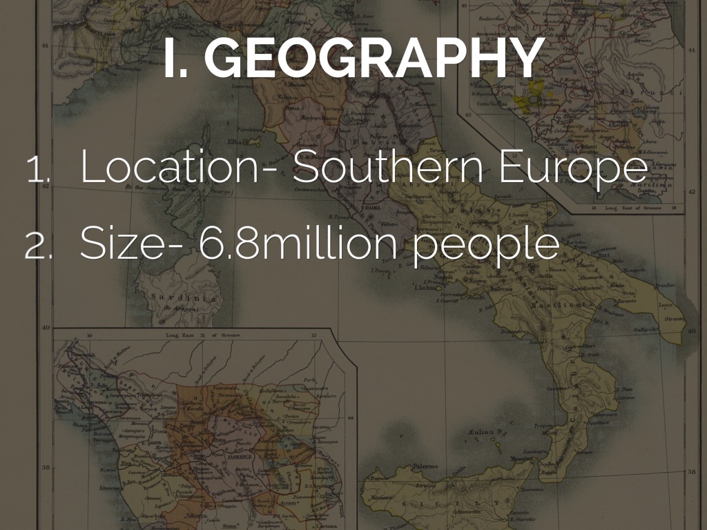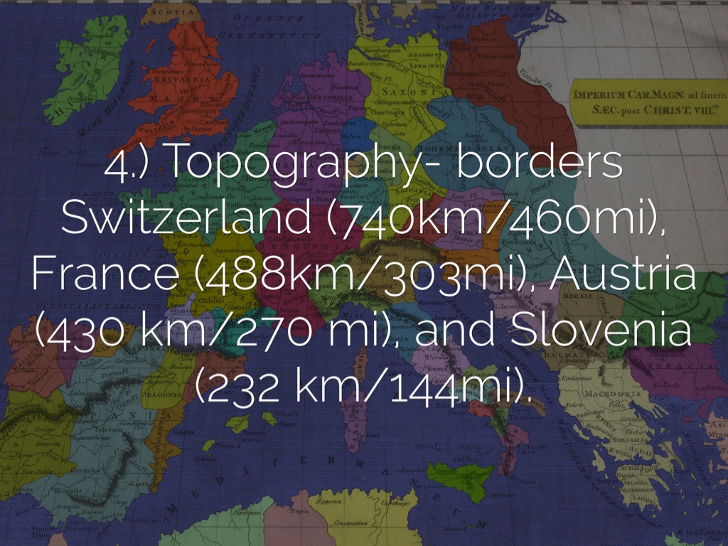 4.) Topography- borders Switzerland (740km/460mi), France (488km/303mi), Austria (430 km/270 mi), and Slovenia (232 km/144mi).