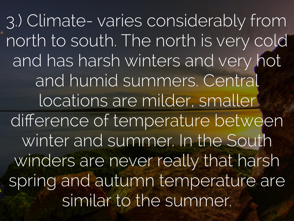 3.) Climate- varies considerably from north to south. The north is very cold and has harsh winters and very hot and humid summers. Central locations are milder, smaller difference of temperature between winter and summer. In the South winders are never really that harsh spring and autumn temperature are similar to the summer.