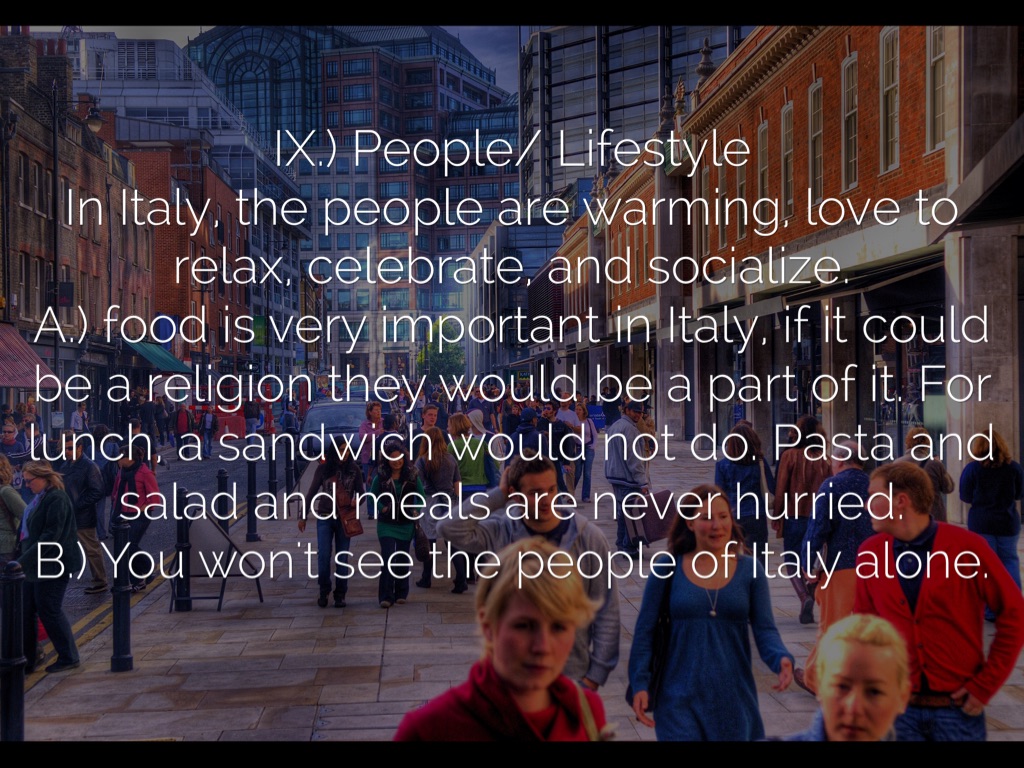 A.) food is very important in Italy, if it could be a religion they would be a part of it. For lunch, a sandwich would not do. Pasta and salad and meals are never hurried.