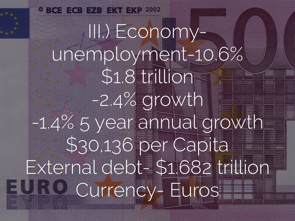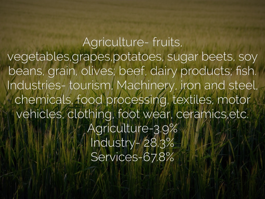 Industries- tourism, Machinery, iron and steel, chemicals, food processing, textiles, motor vehicles, clothing, foot wear, ceramics,etc.