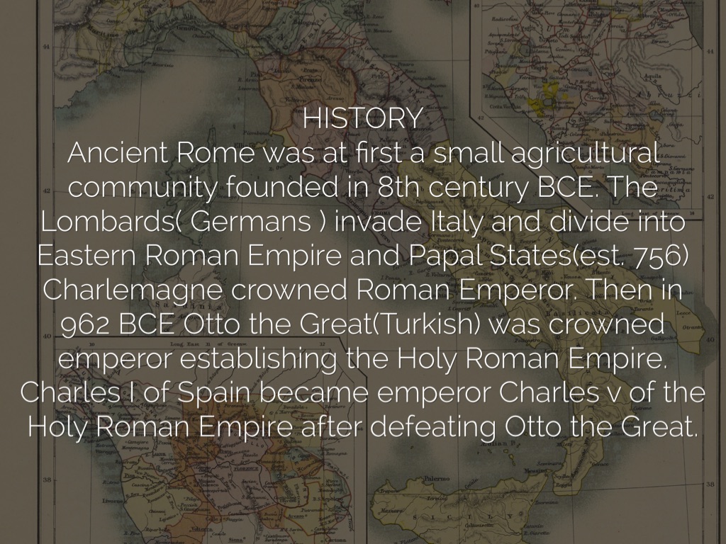 Ancient Rome was at first a small agricultural community founded in 8th century BCE. The Lombards( Germans ) invade Italy and divide into Eastern Roman Empire and Papal States(est. 756)
