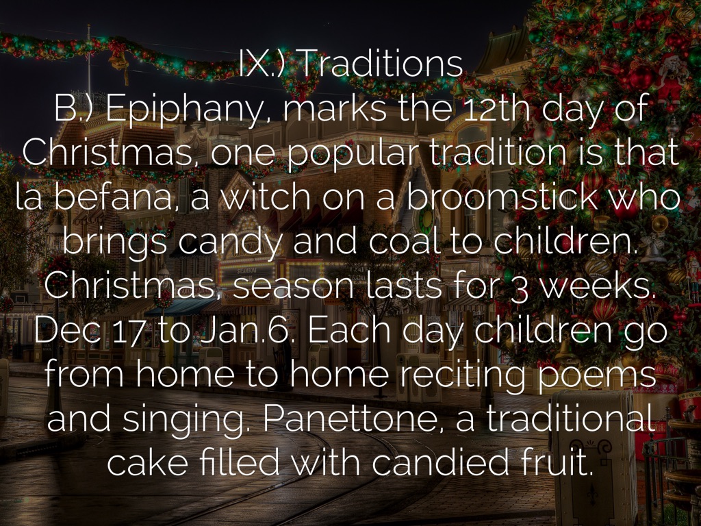 B.) Epiphany, marks the 12th day of Christmas, one popular tradition is that la befana, a witch on a broomstick who brings candy and coal to children. Christmas, season lasts for 3 weeks. Dec 17 to Jan.6. Each day children go from home to home reciting poems and singing. Panettone, a traditional cake filled with candied fruit.
