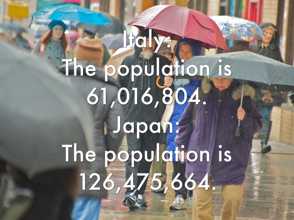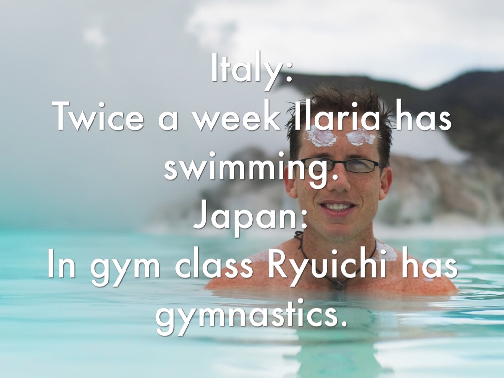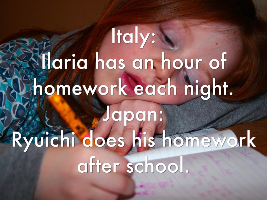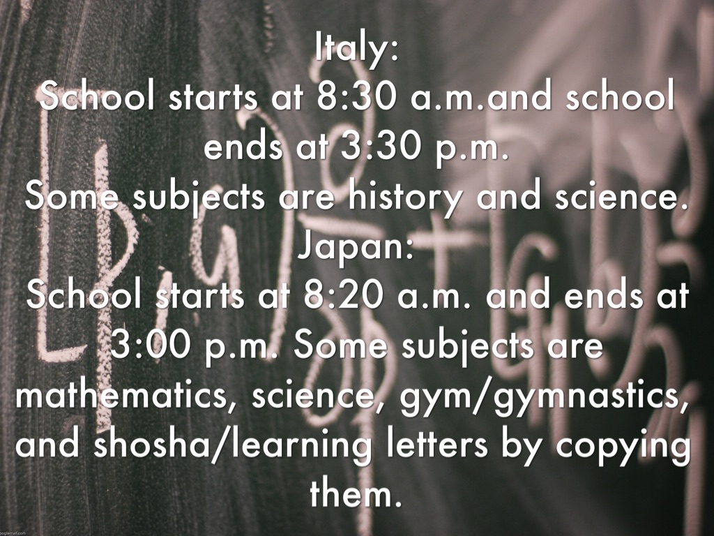 Italy: School starts at 8:30 a.m.and school ends at 3:30 p.m. Some subjects are history and science. Japan: School starts at 8:20 a.m. and ends at 3:00 p.m. Some subjects are mathematics, science, gym/gymnastics, and shosha/learning letters by copying them.