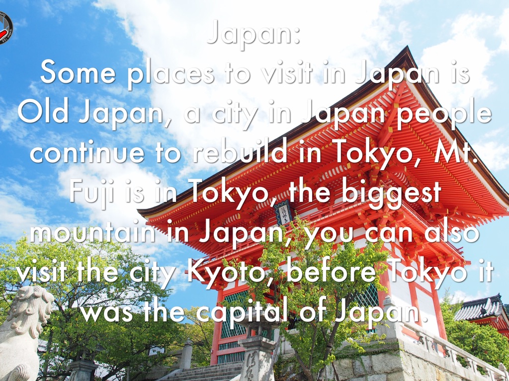 Japan: Some places to visit in Japan is Old Japan, a city in Japan people continue to rebuild in Tokyo, Mt. Fuji is in Tokyo, the biggest mountain in Japan, you can also visit the city Kyoto, before Tokyo it was the capital of Japan.