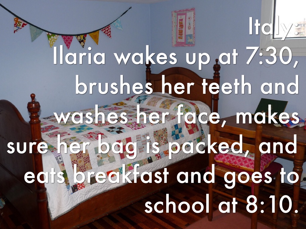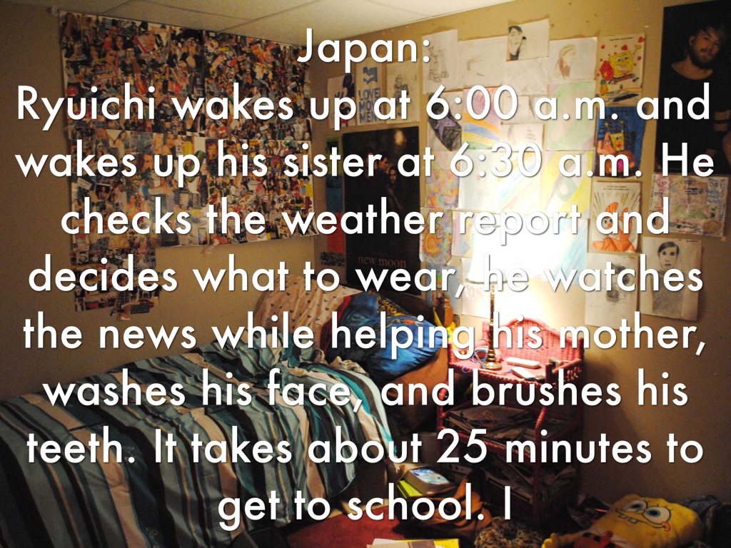 Japan: Ryuichi wakes up at 6:00 a.m. and wakes up his sister at 6:30 a.m. He checks the weather report and decides what to wear, he watches the news while helping his mother, washes his face, and brushes his teeth. It takes about 25 minutes to get to school. I