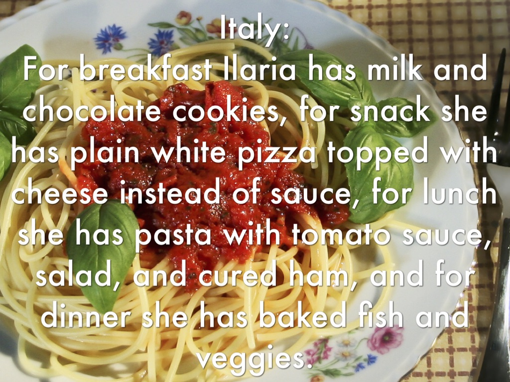 Italy: For breakfast Ilaria has milk and chocolate cookies, for snack she has plain white pizza topped with cheese instead of sauce, for lunch she has pasta with tomato sauce, salad, and cured ham, and for dinner she has baked fish and veggies.