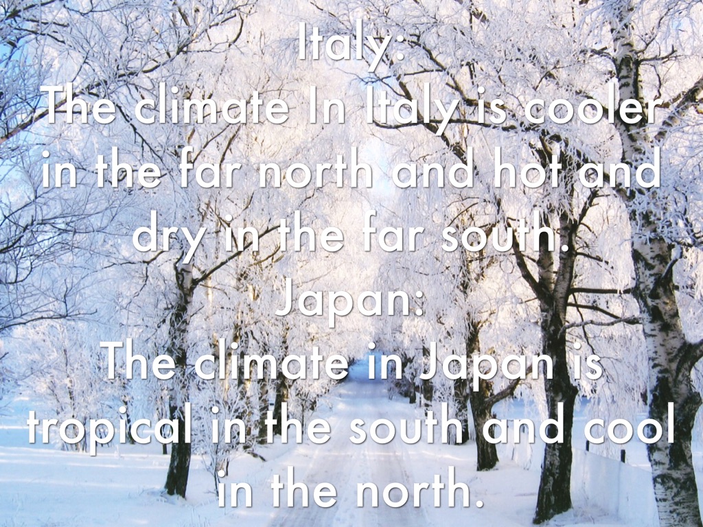 Italy: The climate In Italy is cooler in the far north and hot and dry in the far south. Japan: The climate in Japan is tropical in the south and cool in the north.