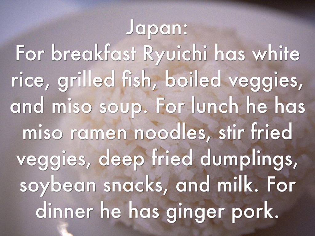 Japan: For breakfast Ryuichi has white rice, grilled fish, boiled veggies, and miso soup. For lunch he has miso ramen noodles, stir fried veggies, deep fried dumplings, soybean snacks, and milk. For dinner he has ginger pork.