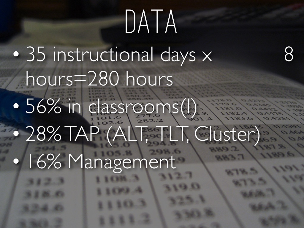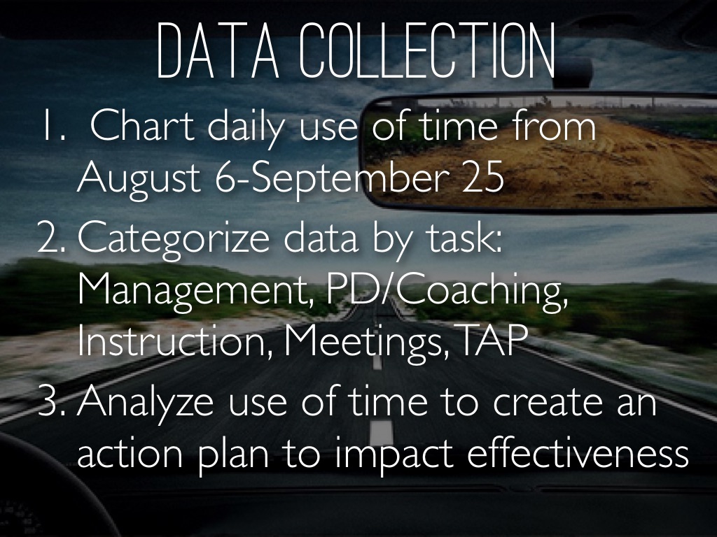 • Categorize data by task: Management, PD/Coaching, Instruction, Meetings, TAP