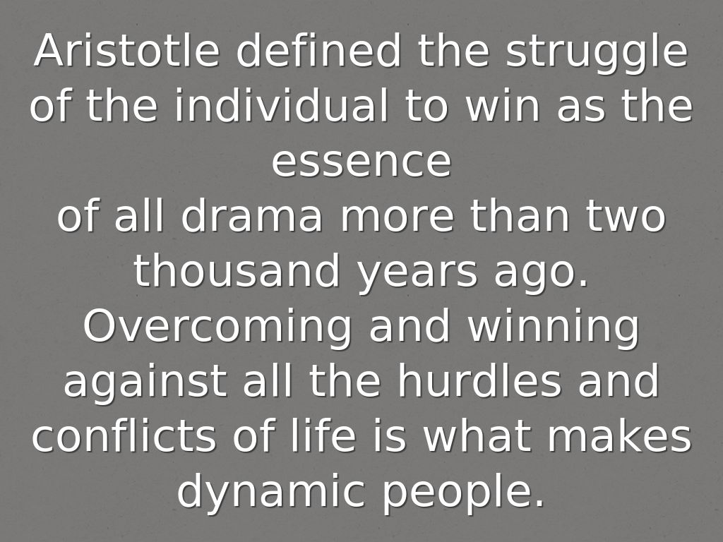 Aristotle defined the struggle of the individual to win as the essence of all drama more than two thousand years ago. Overcoming and winning against all the hurdles and conflicts of life is what makes dynamic people.
