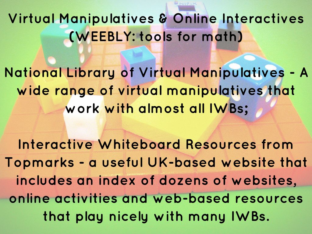 National Library of Virtual Manipulatives - A wide range of virtual manipulatives that work with almost all IWBs;