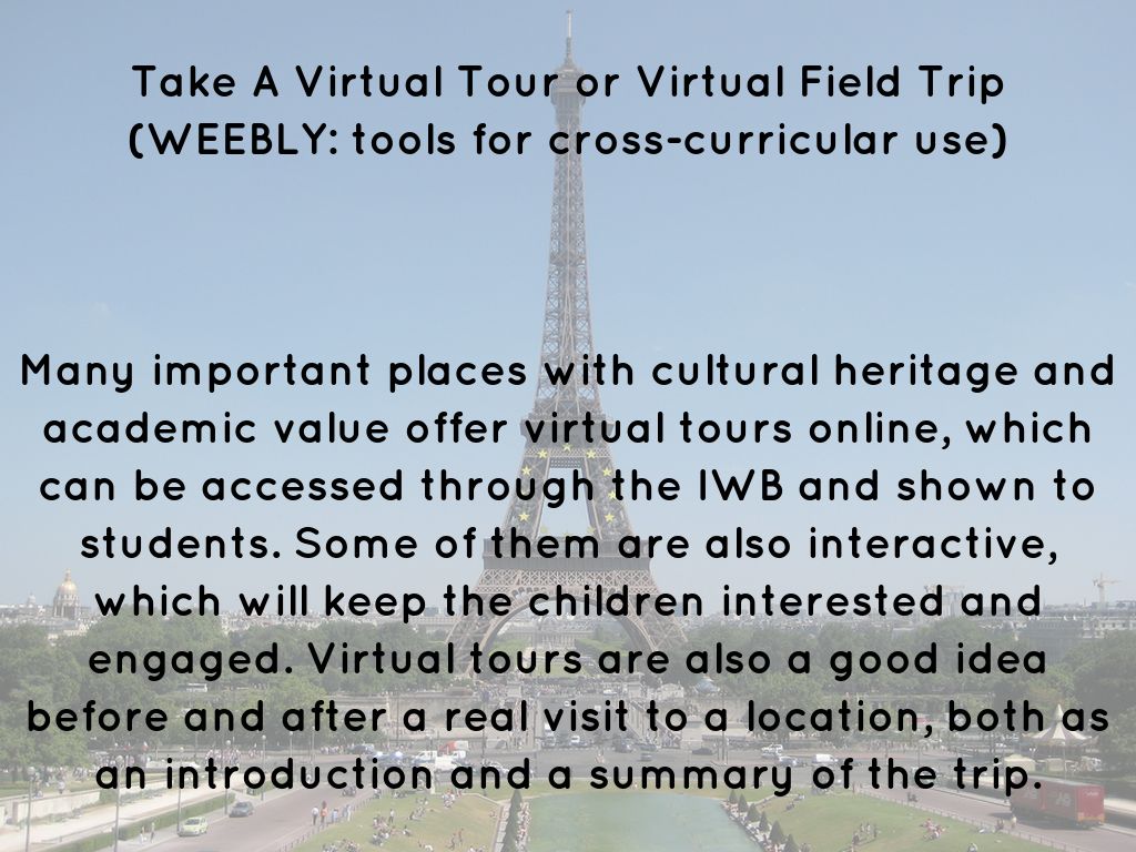 Many important places with cultural heritage and academic value offer virtual tours online, which can be accessed through the IWB and shown to students. Some of them are also interactive, which will keep the children interested and engaged. Virtual tours are also a good idea before and after a real visit to a location, both as an introduction and a summary of the trip.