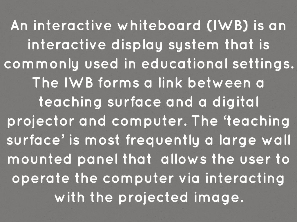An interactive whiteboard (IWB) is an interactive display system that is commonly used in educational settings. The IWB forms a link between a teaching surface and a digital projector and computer. The ‘teaching surface’ is most frequently a large wall mounted panel that allows the user to operate the computer via interacting with the projected image.
