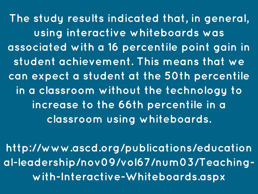 The study results indicated that, in general, using interactive whiteboards was associated with a 16 percentile point gain in student achievement. This means that we can expect a student at the 50th percentile in a classroom without the technology to increase to the 66th percentile in a classroom using whiteboards.
