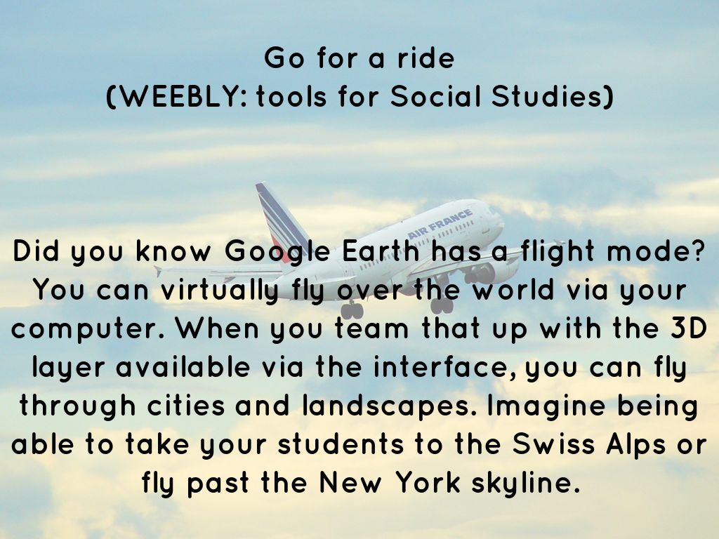 Did you know Google Earth has a flight mode? You can virtually fly over the world via your computer. When you team that up with the 3D layer available via the interface, you can fly through cities and landscapes. Imagine being able to take your students to the Swiss Alps or fly past the New York skyline.