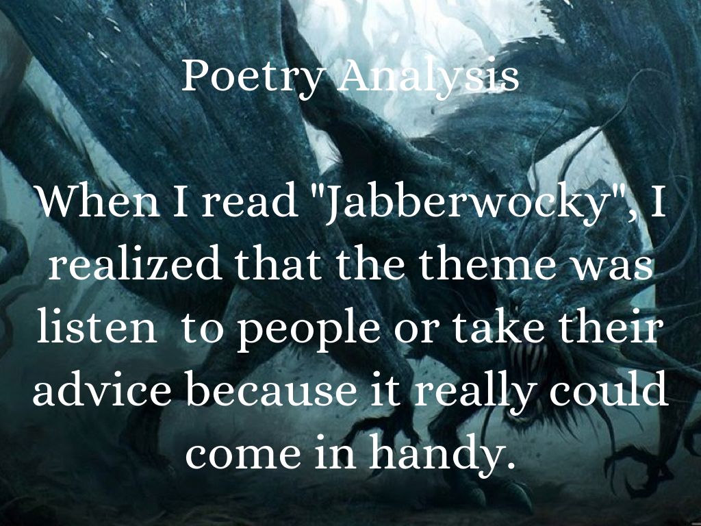 When I read the poem I think it's about a boy going out to get green pigs, but his father warns him about a monster called the Jabberwock that can do a bunch of horrible stuff.