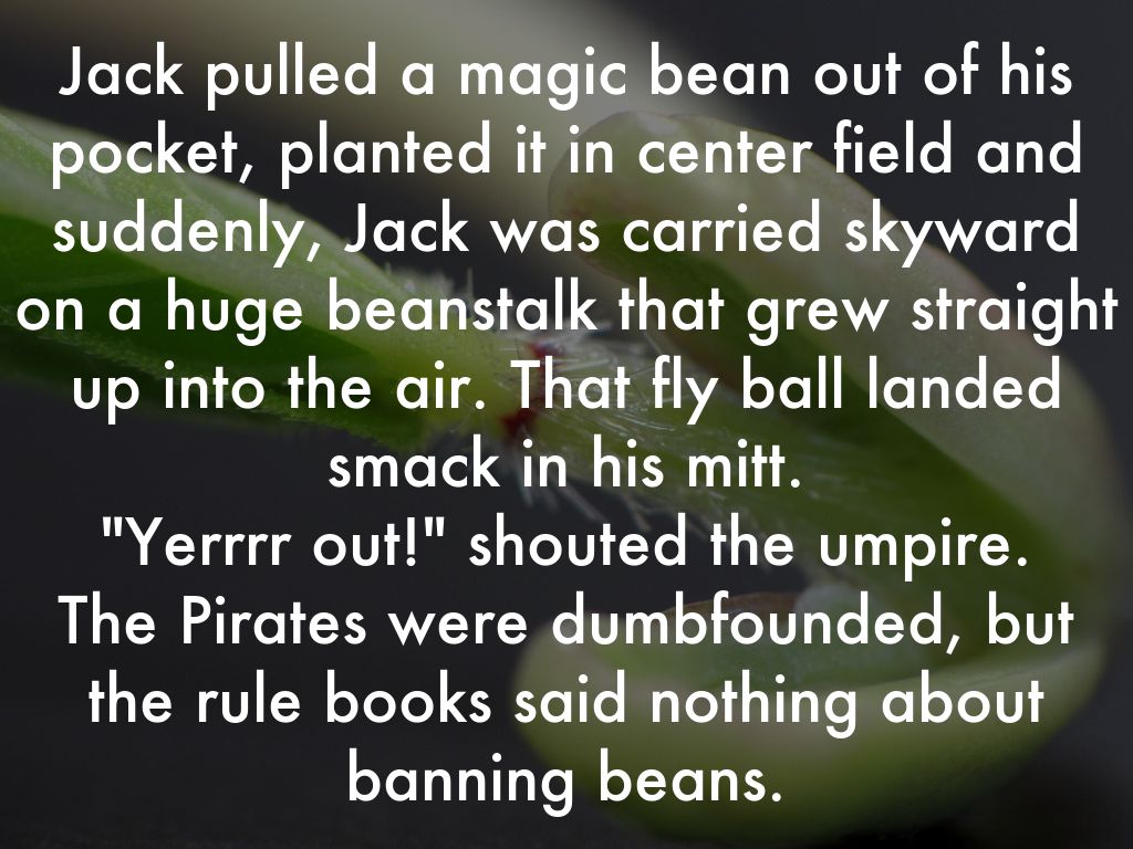 Jack pulled a magic bean out of his pocket, planted it in center field and suddenly, Jack was carried skyward on a huge beanstalk that grew straight up into the air. That fly ball landed smack in his mitt. "Yerrrr out!" shouted the umpire. The Pirates were dumbfounded, but the rule books said nothing about banning beans.