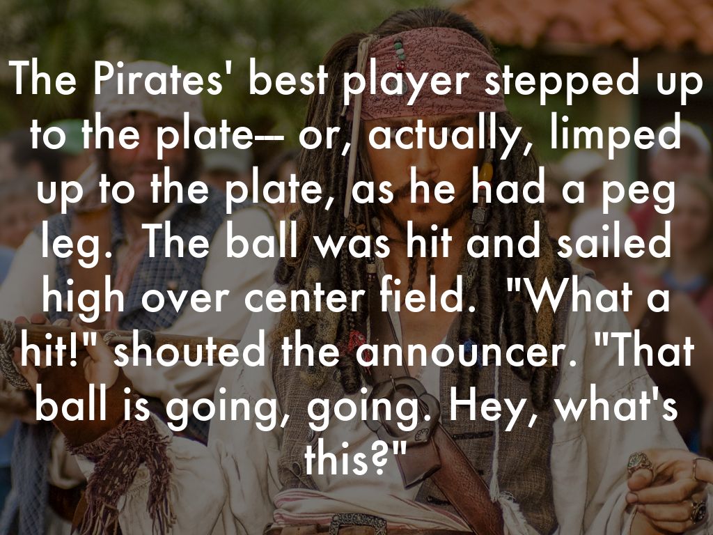 The Pirates' best player stepped up to the plate--- or, actually, limped up to the plate, as he had a peg leg. The ball was hit and sailed high over center field. "What a hit!" shouted the announcer. "That ball is going, going. Hey, what's this?"