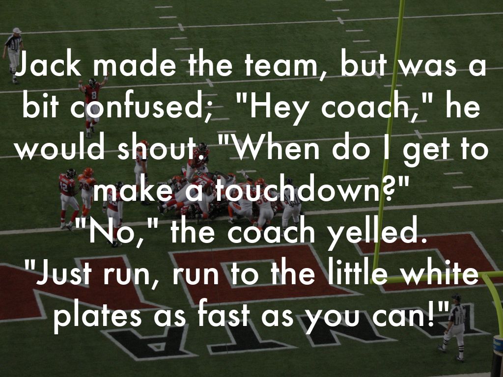 Jack made the team, but was a bit confused; "Hey coach," he would shout. "When do I get to make a touchdown?" "No," the coach yelled. "Just run, run to the little white plates as fast as you can!"