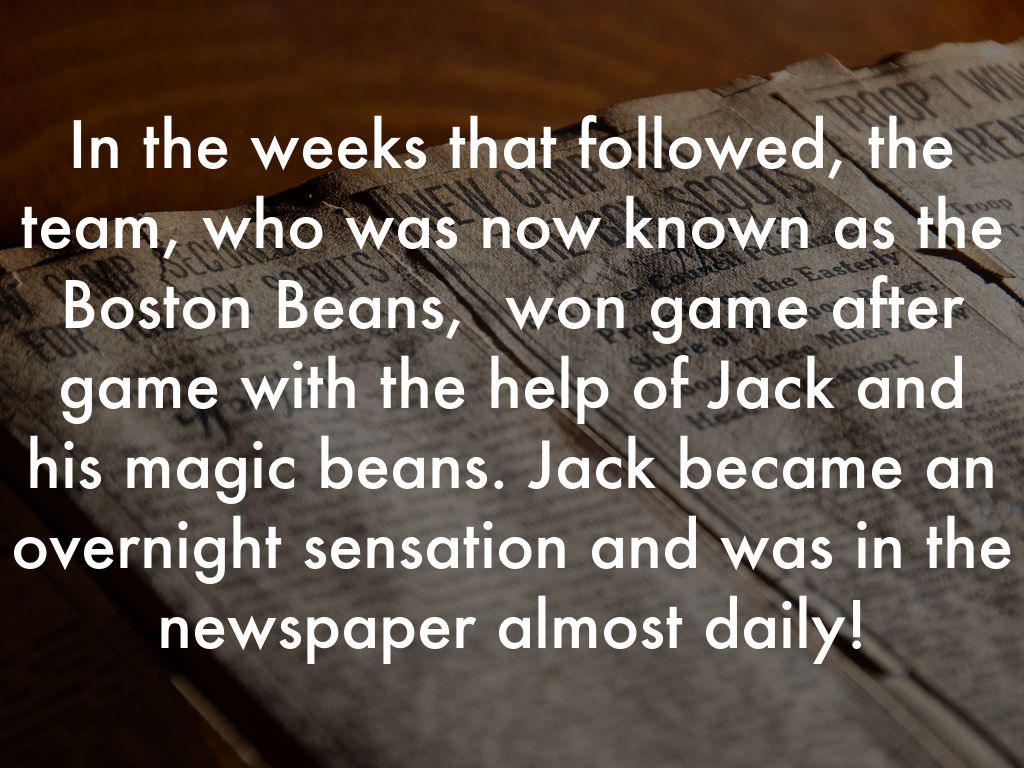 In the weeks that followed, the team, who was now known as the Boston Beans, won game after game with the help of Jack and his magic beans. Jack became an overnight sensation and was in the newspaper almost daily!
