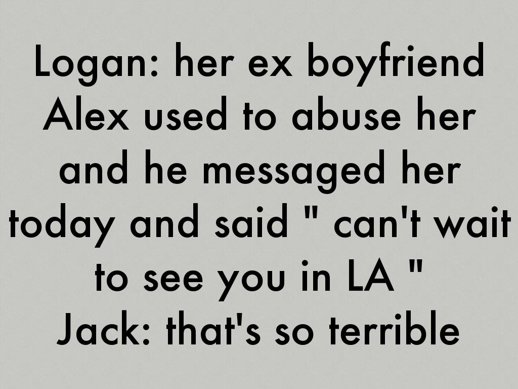 Logan: her ex boyfriend Alex used to abuse her and he messaged her today and said " can't wait to see you in LA "