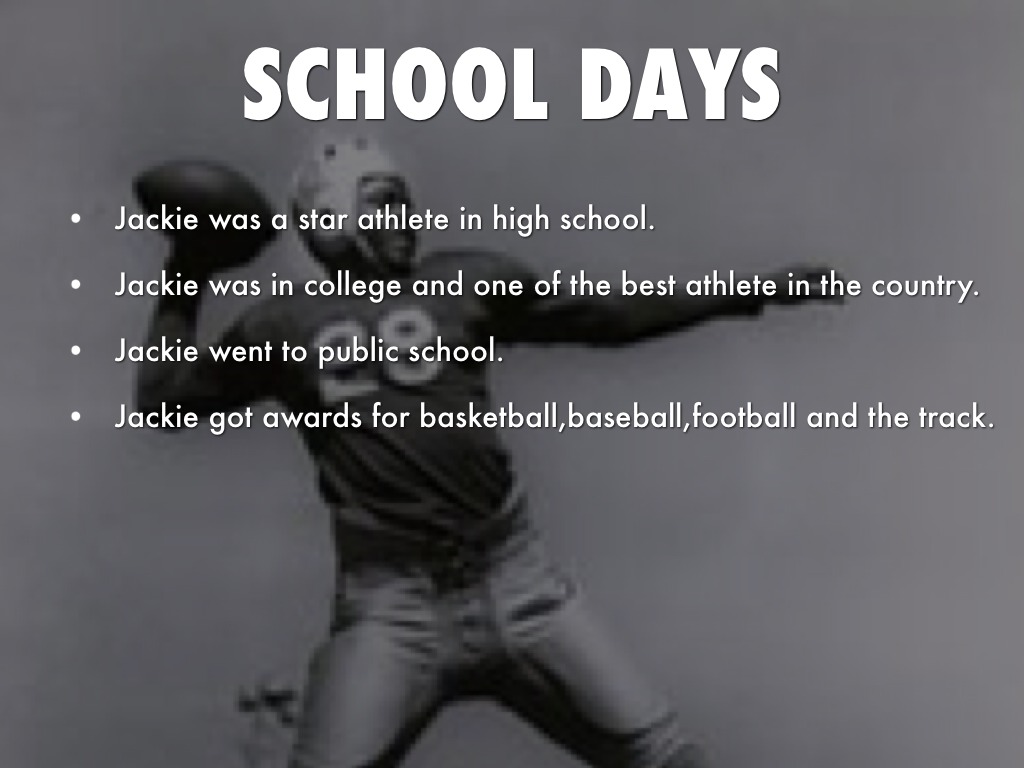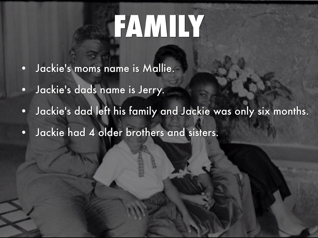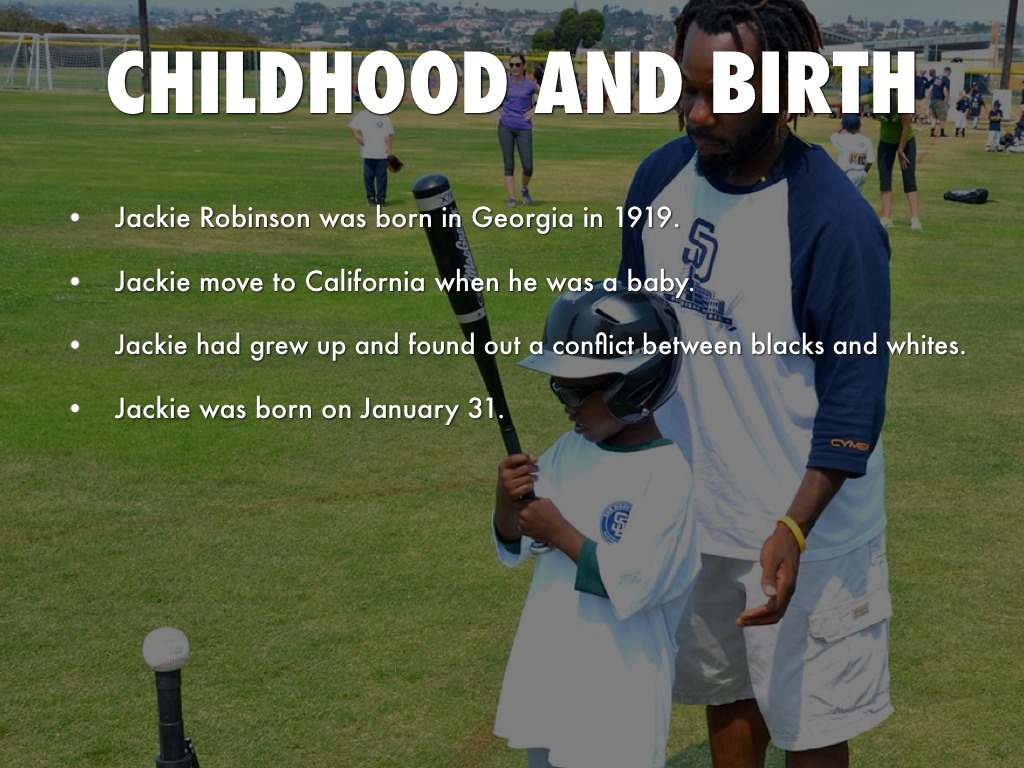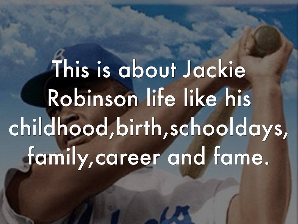 This is about Jackie Robinson life like his childhood,birth,schooldays,family,career and fame.