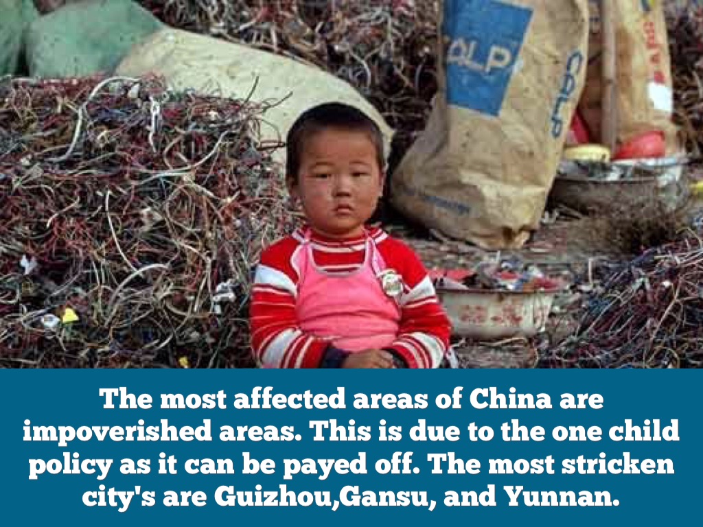 The most affected areas of China are impoverished areas. This is due to the one child policy as it can be payed off. The most stricken city's are Guizhou,Gansu, and Yunnan.